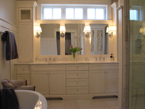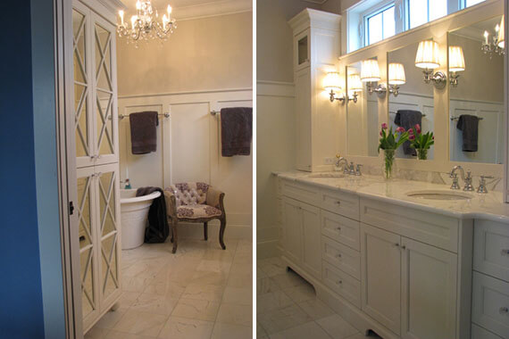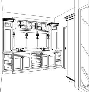 As a result of the time spent with the clients, a measuring tape, and the design program, we were able to design a vanity that has the beauty of traditional elements along with the functional requirements of the clients. We were also able to create balance while providing ample storage and counter space between the two sinks. Adding the wall sconces to the mirror framing, all done by our cabinet makers, gave the vanity the finishing traditional touches it needed.